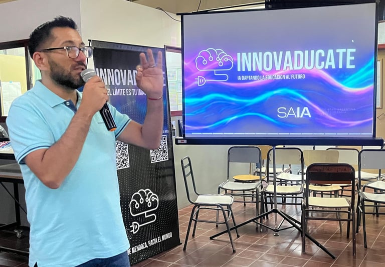 En un mundo en constante evolución tecnológica, el aprendizaje debe avanzar al mismo ritmo que la sociedad y la economía digital. Junto al Senador Provincial Sergio Marquez y el equipo de INNOVADUCATE, tuvimos el privilegio de ofrecer una capacitación en la Escuela Nº 4-069 "Alfonsina Storni" en Luzuriaga, dedicada a explorar el potencial de la Inteligencia Artificial (IA) aplicada a la Educación. Esta jornada no solo reafirmó nuestro compromiso con los docentes de Maipú, sino que también nos demostró cuán fundamental es apostar a la innovación en el aula.